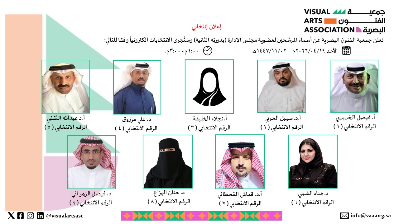 تعلن جمعية الفنون البصرية عن قائمة المرشحين لعضوية مجلس الإدارة (الدورة الثانية)، وذلك تمهيدًا لإجراء الانتخابات إلكترونيًا في الموعد المحدد، ووفقًا لأحكام نظام الجمعيات والمؤسسات الأهلية، ولائحته التنفيذية، واللائحة الأساسية للجمعية المعتمدة من المركز الوطني لتنمية القطاع غير الربحي.